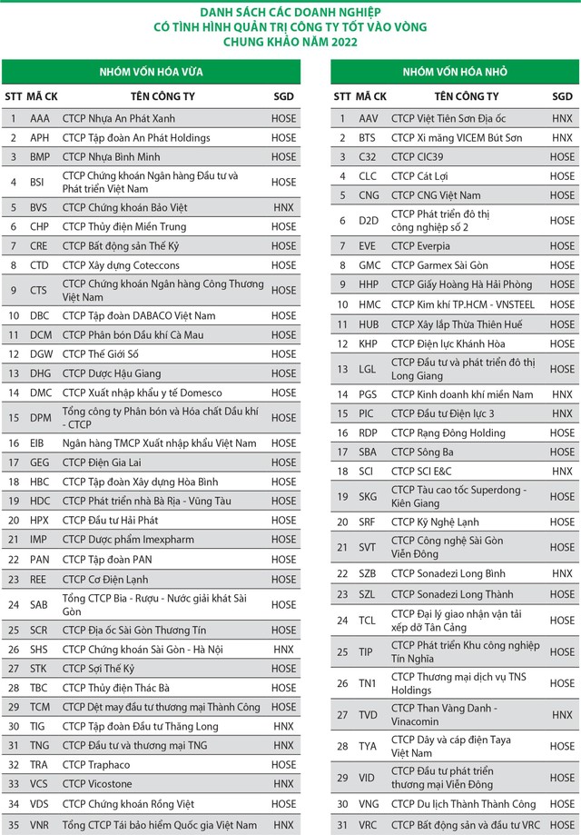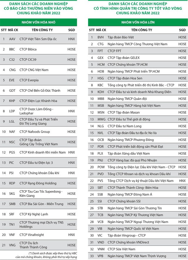 Ở hạng mục báo cáo quản trị công ty, có 99 doanh nghiệp có tình hình quản trị công ty tốt nhất được chọn vào vòng chung khảo, phân theo từng nhóm vốn hóa. Trong đó, 33 doanh nghiệp thuộc nhóm vốn hóa lớn, 35 doanh nghiệp thuộc nhóm vốn hóa vừa và 31 doanh nghiệp thuộc nhóm vốn hóa nhỏ.