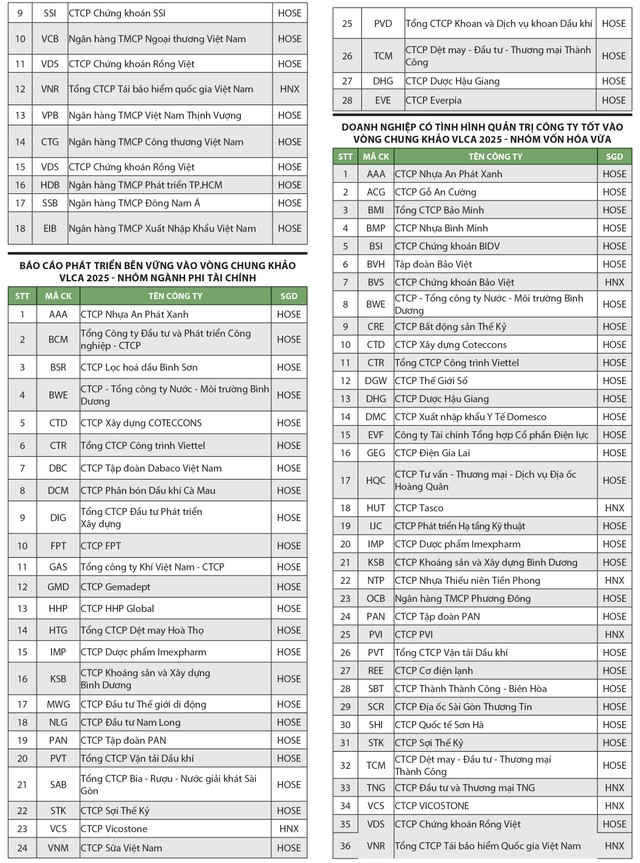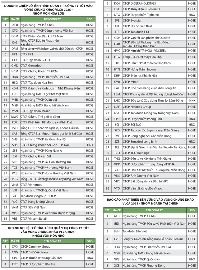 Có 107 doanh nghiệp được chọn vào vòng chung khảo: 35 doanh nghiệp vốn hóa lớn, 36 doanh nghiệp vốn hóa vừa và 36 doanh nghiệp vốn hóa nhỏ (xem danh sách, được xếp theo ABC). Việc chấm điểm dựa trên các tài liệu công bố rộng rãi như báo cáo thường niên, báo cáo quản trị công ty, báo cáo phát triển bền vững, điều lệ, quy chế quản trị, tài liệu họp đại hội đồng cổ đông… đến 30/4/2025 (thông tin đại hội đồng cổ đông đến 30/6/2025 với doanh nghiệp gia hạn họp).