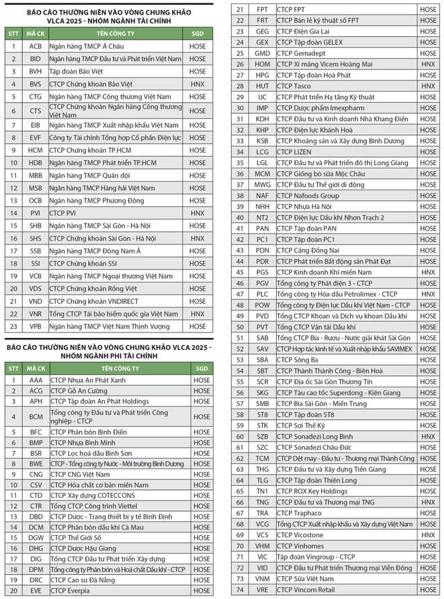 (ĐTCK) Sau gần 6 tháng chấm sơ khảo và soát xét kết quả bởi Big 4, Ban Tổ chức Cuộc bình chọn Doanh nghiệp niêm yết 2025 (Vietnam Listed Company Awards - VLCA) đã chính thức công bố danh sách các doanh nghiệp lọt vào vòng chung khảo.