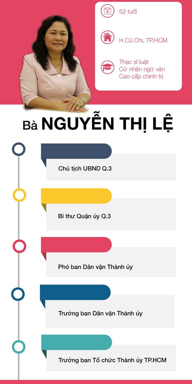 Đồng chí Nguyễn Thị Lệ có nhiều kinh nghiệm, thâm niên làm việc ở quận 3. Năm 2010, đồng chí Nguyễn Thị Lệ được bổ nhiệm giữ chức Chủ tịch UBND quận 3. Năm 2012, đồng chí giữ chức Bí thư Quận ủy quận 3.