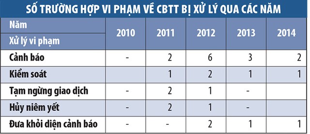 Trong năm 2013 và 2014, số lượng vi phạm CBTT của các công ty niêm yết lần lượt giảm 28% và 16% so với cùng kỳ năm trước. Số trường hợp vi phạm bị xử lý theo quy định cũng giảm dần qua các năm (xem bảng).