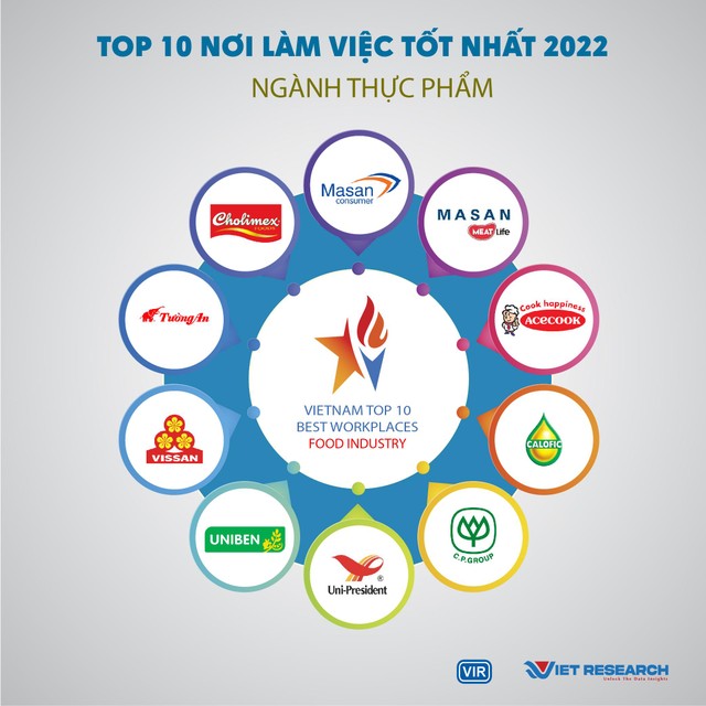 Qua nghiên cứu và đánh giá trên các tiêu chí liên quan đến cơ hội nghề nghiệp, lương thưởng và phúc lợi, văn hóa doanh nghiệp, sự cân bằng giữa công việc và cuộc sống và các yếu tố khác cũng như tiềm năng tăng trưởng và uy tín của doanh nghiệp và thương hiệu nhà tuyển dụng trên thị trường, Viet Research và Báo Đầu tư đưa ra danh sách Top 10 nơi làm việc tốt nhất trong ngành Thực phẩm – Đồ uống bao gồm:
