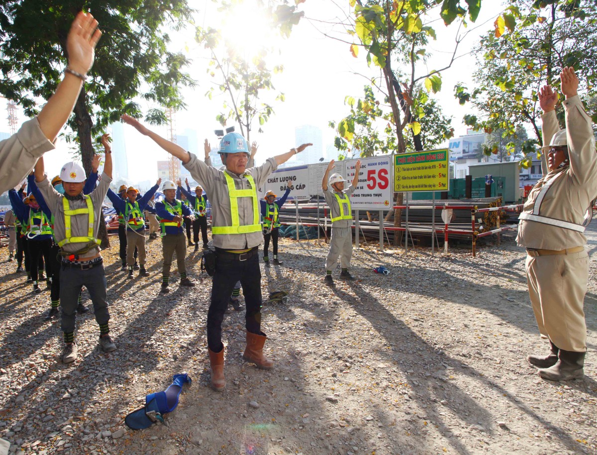 Sáng sớm, chuyên gia Nhật hướng dẫn công nhân tập thể dục trước khi vào làm việc.