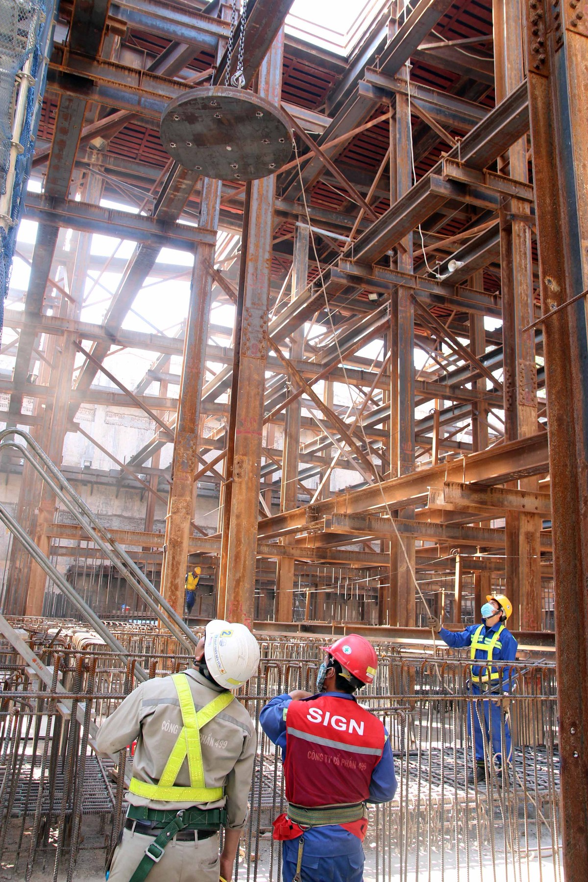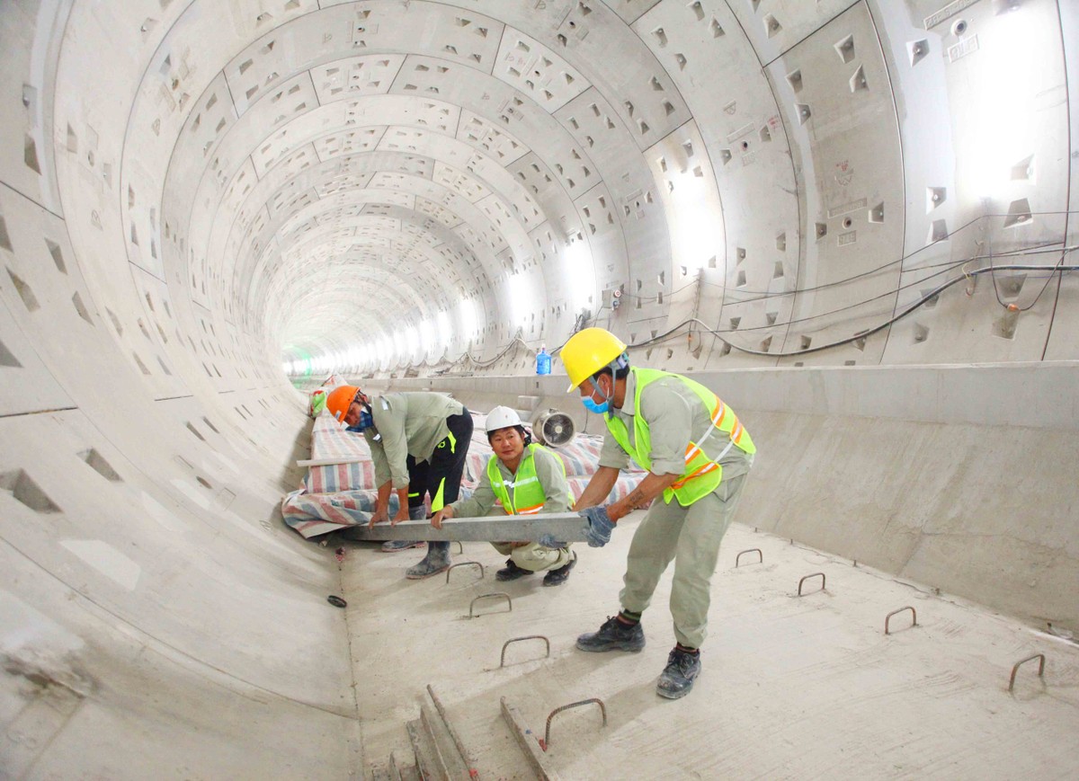 Công nhân tại đoạn hầm Metro nối tầng B2 của ga Nhà hát Thành phố với ga Ba Son đang tích cực làm việc để chuẩn bị lắp đặt đường ray.