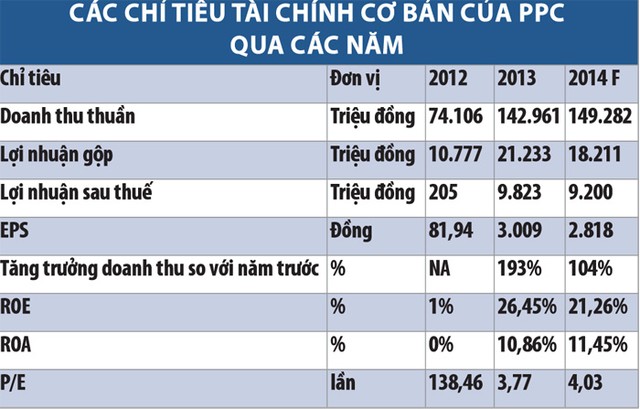 Ngoài ra, một số yếu tố khác, như lãi suất ngân hàng giảm cũng giúp chi phí lãi vay của Công ty giảm được 6,57% và chi phí bán hàng giảm hơn so với dự toán. Hoạt động kinh doanh thuận lợi của PPC được dự báo sẽ tiếp tục được tiếp nối trong năm 2014 với mức lợi nhuận dự kiến đạt khoảng 9,2 tỷ đồng, cao hơn nhiều so với kế hoạch đặt ra hồi đầu năm (3,7 tỷ đồng). Công ty đã ổn định hoạt động sản xuất - kinh doanh, có lợi nhuận và đảm bảo trả nợ gốc giảm lãi vay nên dự kiến từ năm 2014 trở đi, tỷ lệ chia cổ tức vào khoảng 10 - 15% cùng mức giá khởi điểm chỉ 11.345 đồng, cổ phần Công ty PPC hứa hẹn mang đến lợi nhuận tốt cho các nhà đầu tư.