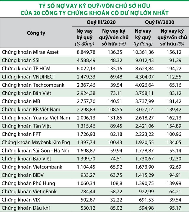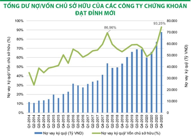 Cụ thể, với tổng dư nợ hơn 70.000 tỷ đồng, hệ số tổng dư nợ/vốn chủ sở hữu của toàn bộ các công ty chứng khoán đạt mức cao nhất trong lịch sử, dù khối công ty này đã thực hiện tăng vốn trong thời gian trước đó. Theo số liệu báo cáo quý IV/2020, tỷ lệ này đạt 93,25%, vượt qua cả mức đỉnh quý I/2018. Không ít công ty gần chạm ngưỡng cho phép theo quy định là được cho vay tối đa 200% vốn chủ sở hữu.