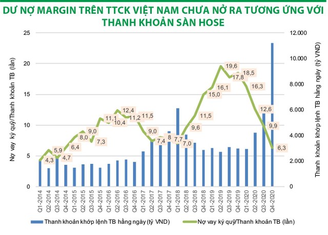 Theo tính toán, thanh khoản khớp lệnh trung bình trên Sở Giao dịch chứng khoán TP.HCM (HOSE) trong quý IV/2020 đạt khoảng 11.200 tỷ đồng/phiên. Theo đó, tỷ số tổng lượng dư nợ ký quỹ/thanh khoản trung bình hằng ngày chỉ là 6,3 lần, đây là một trong những mức thấp nhất kể từ năm 2015 và thấp hơn cả khi VN-Index tạo đỉnh trong quý I/2018.