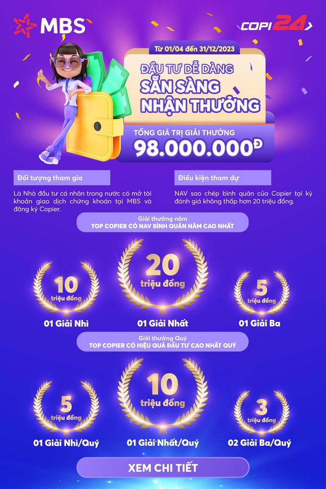 Không những thế, khi trở thành Copier của sản phẩm Copi24, NĐT còn có cơ hội nhận được rất nhiều những giải thưởng hấp dẫn theo quý và cả năm với tổng giá trị giải thưởng lên tới gần 100 triệu đồng