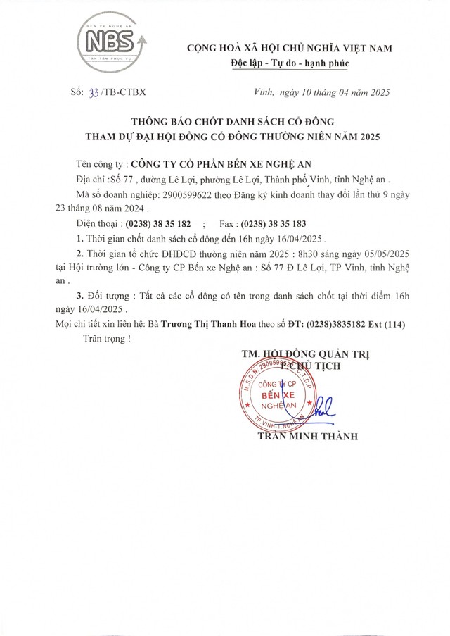 Công ty cổ phần Bến xe Nghệ An (NBS) thông báo chốt danh sách cổ đông tham dự đại hội đồng cổ đông thường niên năm 2025