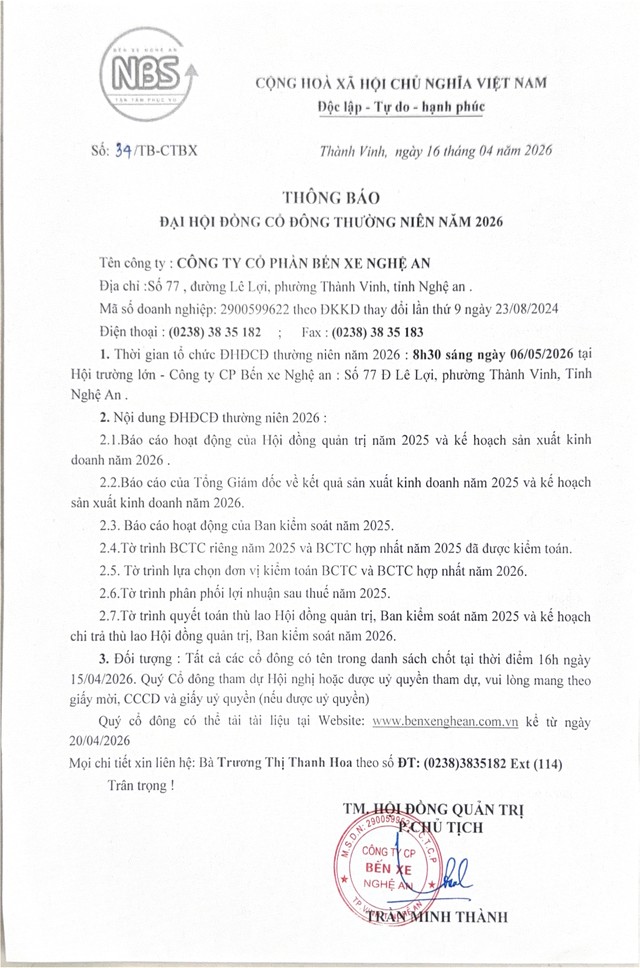 Công ty Cổ phần Bến xe Nghệ An (NBS): Thông báo đại hội đồng cổ đông thường niên năm 2026 20/04/2026 08:00
