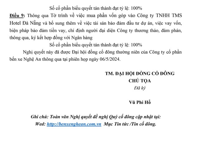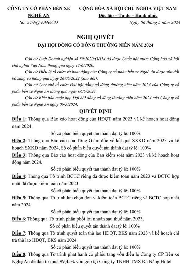 Công ty Cổ phần Bến xe Nghệ An thông báo chốt danh sách cổ đông tham dự Đại hội cổ đông thường niên năm 2024
