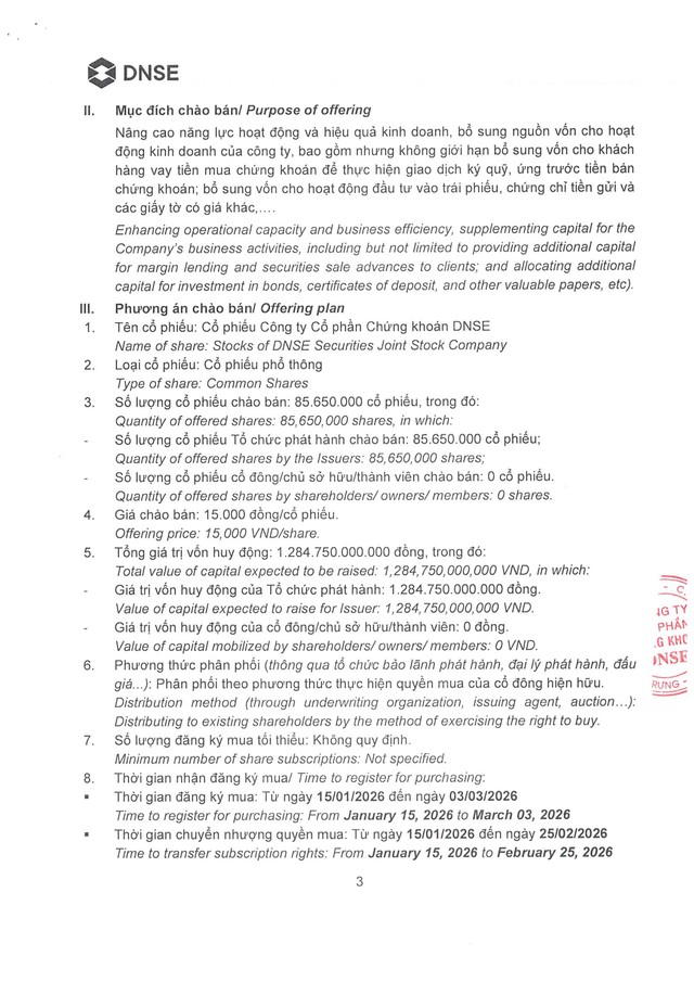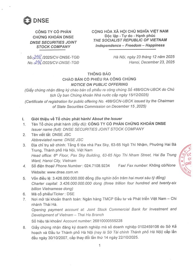 Công ty cổ phần Chứng khoán DNSE (DSE) thông báo chào bán cổ phiếu ra công chúng (kỳ 2)