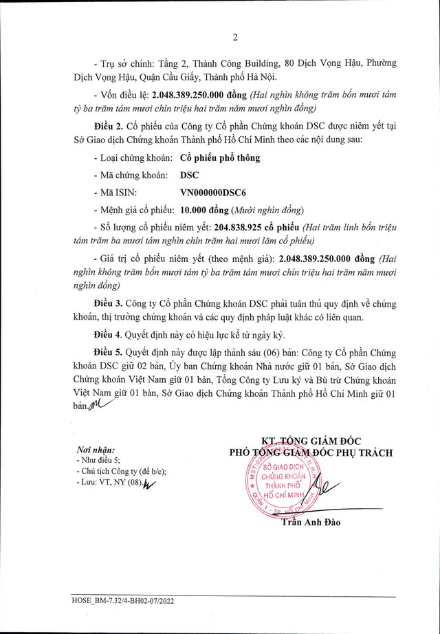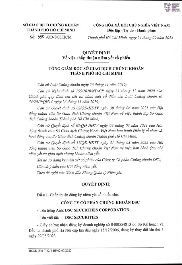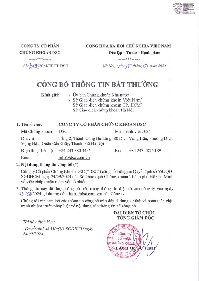 Công ty cổ phần Chứng khoán DSC công bố thông tin bất thường về Quyết định niêm yết số 550/QĐ-SGDHCM ngày 24/9/2024 của Sở GDCK TP.HCM (kỳ 1)