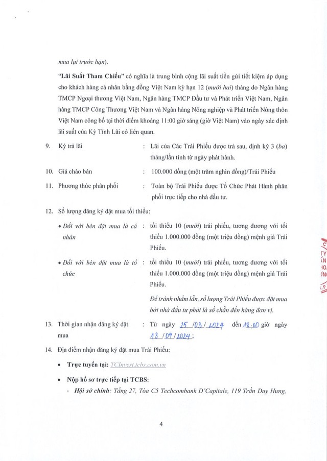 Công ty Cổ phần Chứng khoán Kỹ Thương (TCBS) thông báo chào bán trái phiếu ra công chúng đợt 1 (TCSCPO2325002) theo GCNĐK chào bán số 24/GCN-UBCK do Chủ tịch UBCKNN cấp ngày 22/03/2024