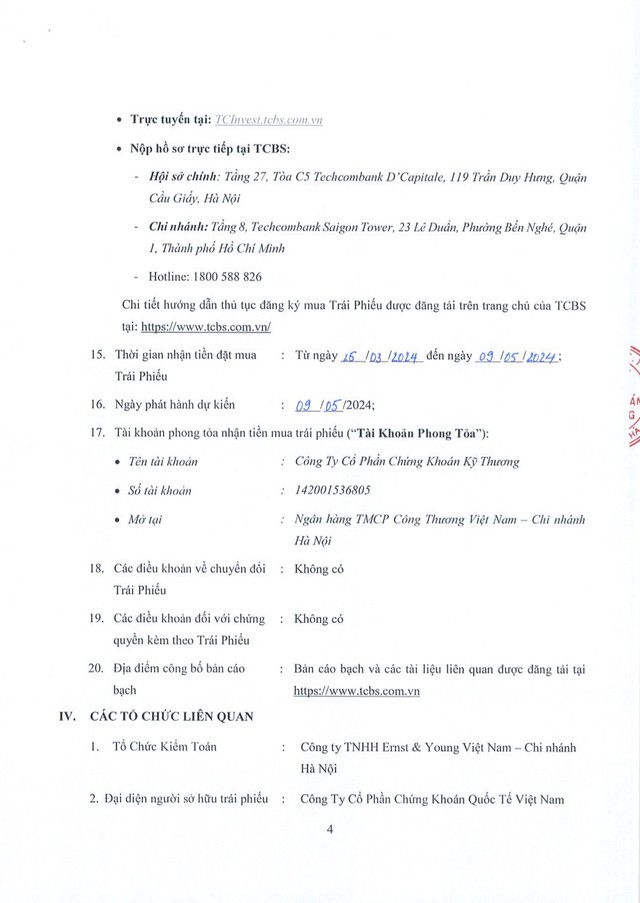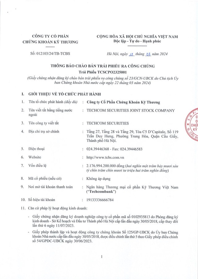Công ty Cổ phần Chứng khoán Kỹ Thương (TCBS) thông báo chào bán trái phiếu ra công chúng đợt 1 (TCSCPO2325001) theo GCNĐK chào bán số 23/GCN-UBCK do Chủ tịch UBCKNN cấp ngày 22/03/2024