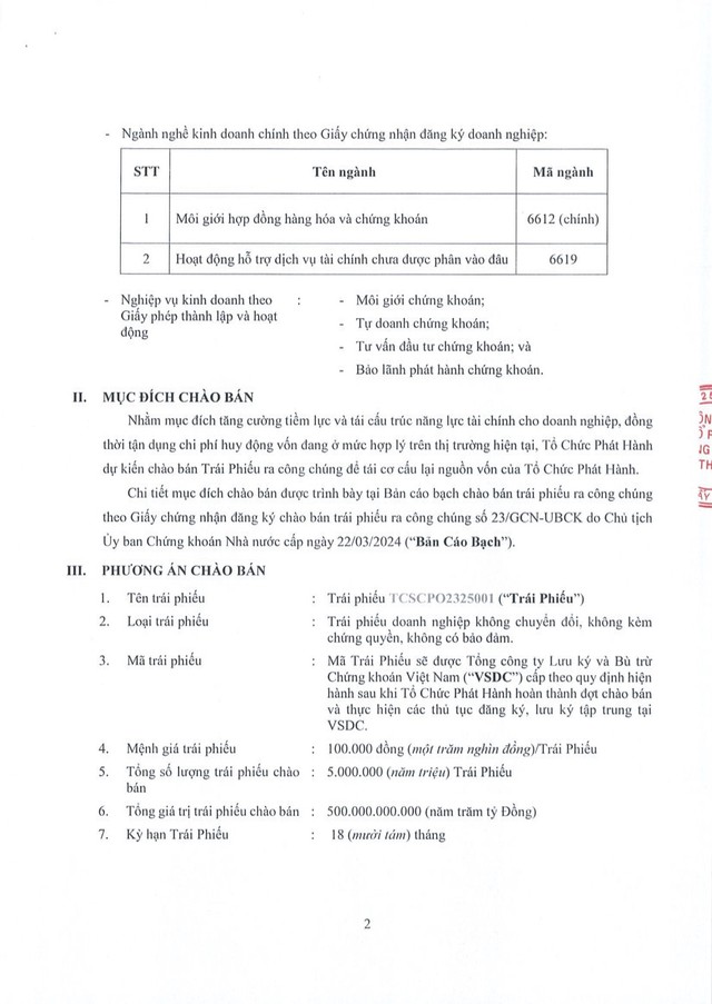 Công ty Cổ phần Chứng khoán Kỹ Thương (TCBS) thông báo chào bán trái phiếu ra công chúng đợt 2 (TCSCPO2325002) theo GCNĐK chào bán số 24/GCN-UBCK do Chủ tịch UBCKNN cấp ngày 22/03/2024