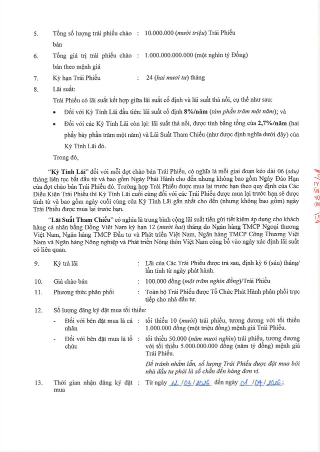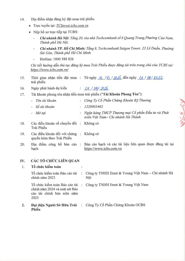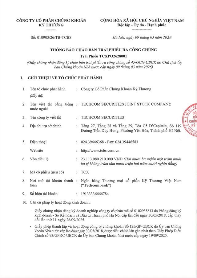Công ty Cổ phần Chứng khoán Kỹ Thương (TCX) thông báo chào bán trái phiếu ra công chúng (Kỳ 1) 09/03/2026 21:30