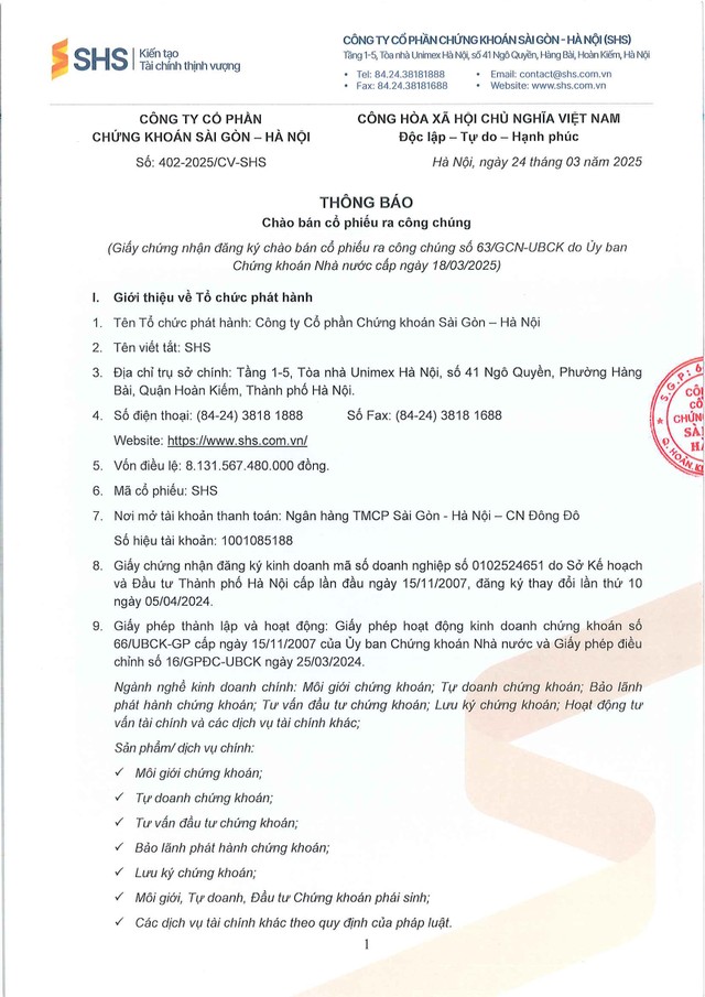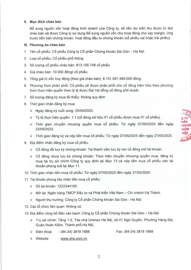 Công ty cổ phần Chứng khoán Sài Gòn - Hà Nội (SHS) thông báo chào bán cổ phiếu ra công chúng (kỳ 2)