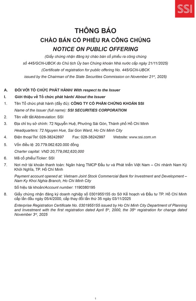 Công ty Cổ phần Chứng khoán Vietcap (VCI) thông báo về việc chào bán 20 mã Chứng quyền có bảo đảm (CW) - Đợt 1 năm 2025 (Kỳ 1) 20/11/2025 16:43