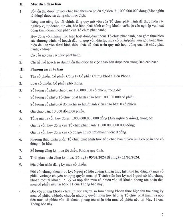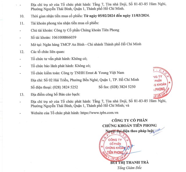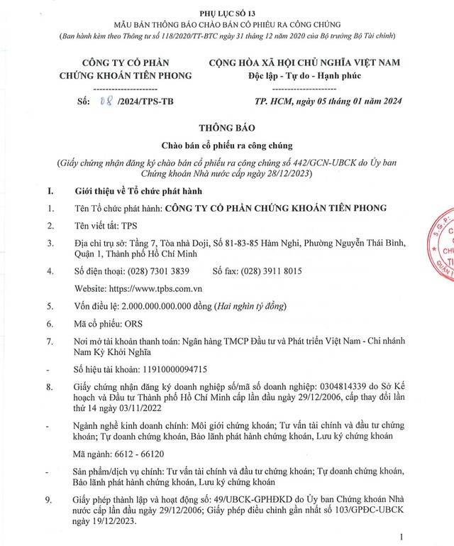 Công ty cổ phần Chứng khoán Tiên Phong (TPS) thông báo chào bán cổ phiếu ra công chúng