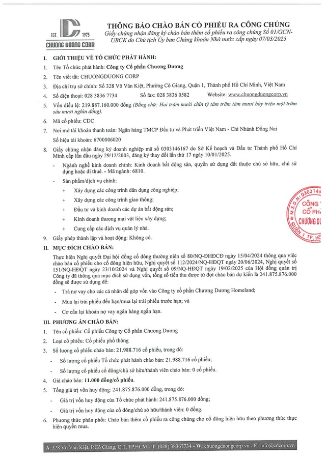 Công ty Cổ phần Xây dựng Coteccons (CTD) thông báo chào bán trái phiếu ra công chúng ( kỳ 1) 31/12/2025 19:00