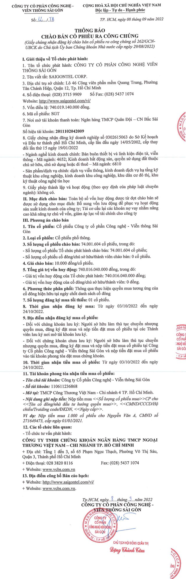 Công ty cổ phần Công nghệ - Viễn thông Sài Gòn (SGT) thông báo chào bán cổ phiếu ra công chúng