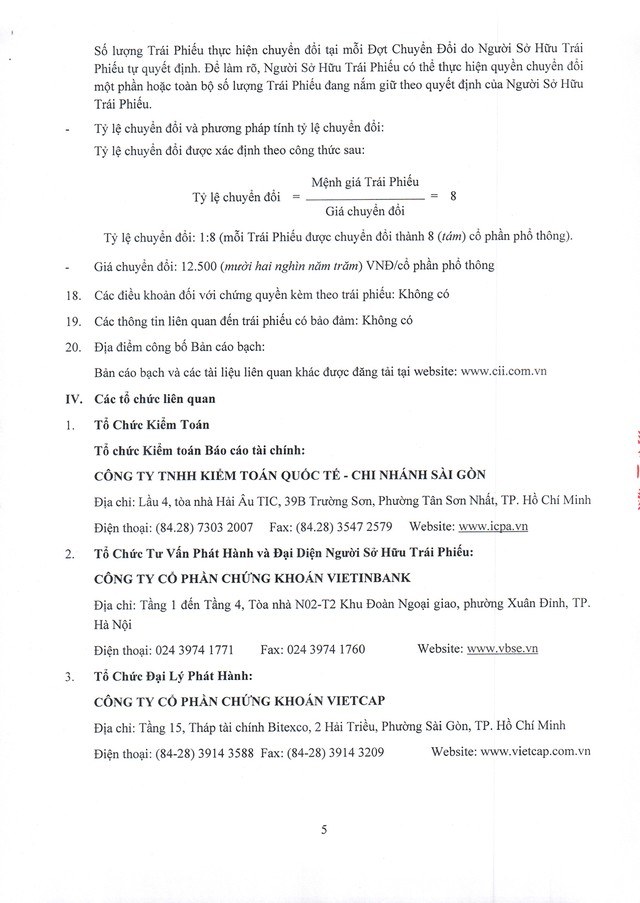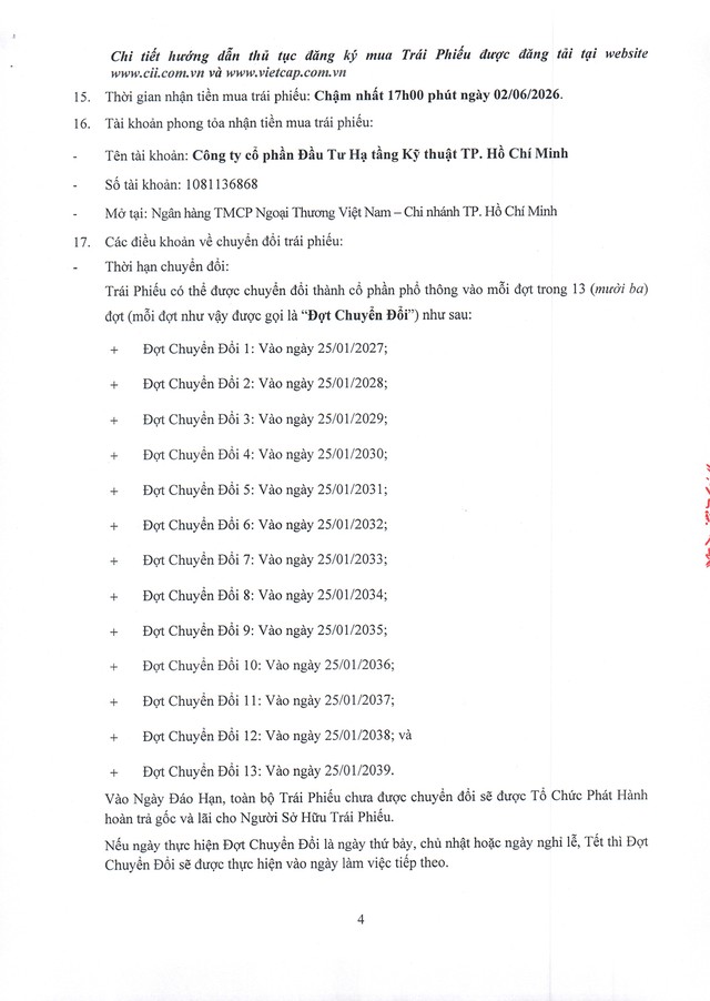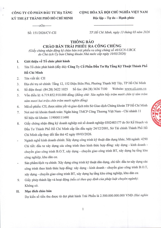 Công ty Cổ phần Đầu tư Hạ tầng Kỹ thuật Thành phố Hồ Chí Minh (CII) thông báo chào bán trái phiếu ra công chúng (kỳ 1) 16/03/2026 08:00