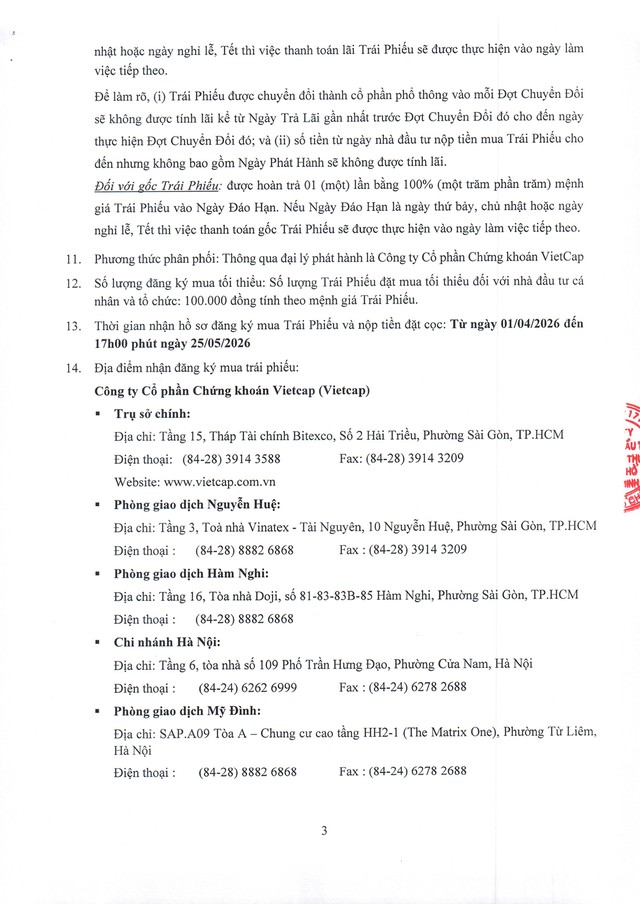 Công ty Cổ phần Chứng khoán Kỹ Thương (TCX) thông báo chào bán trái phiếu ra công chúng (Kỳ 3) 11/03/2026 08:00