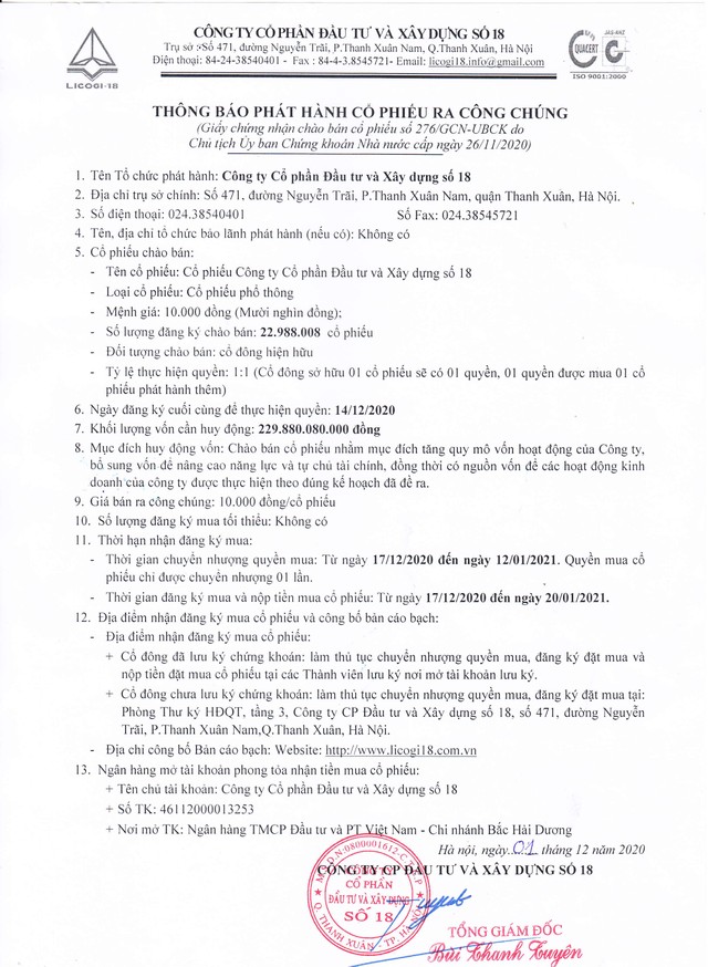 Công ty cổ phần Đầu tư và Xây dựng số 18 thông báo phát hành cổ phiếu ra công chúng