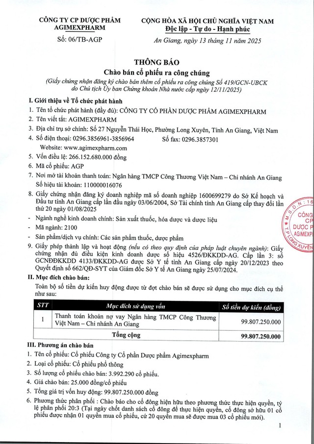 Công ty cổ phần Dược phẩm AgimexPharm (AGP) thông báo chào bán cổ phiếu ra công chúng (Kỳ 1) 14/11/2025 07:48