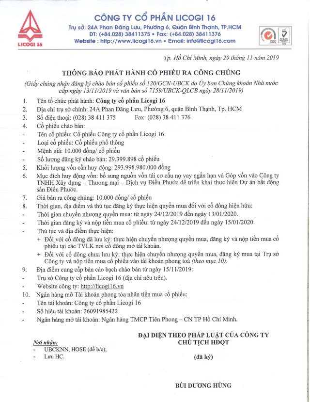 Công ty cổ phần Licogi 16 thông báo phát hành cổ phiếu ra công chúng
