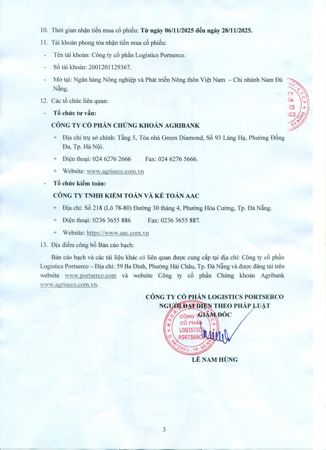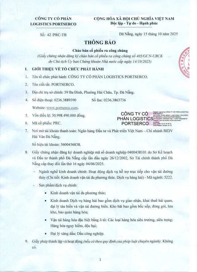 Công ty cổ phần Logistics Portserco (PRC) thông báo chào bán cổ phiếu ra công chúng (Kỳ 2)