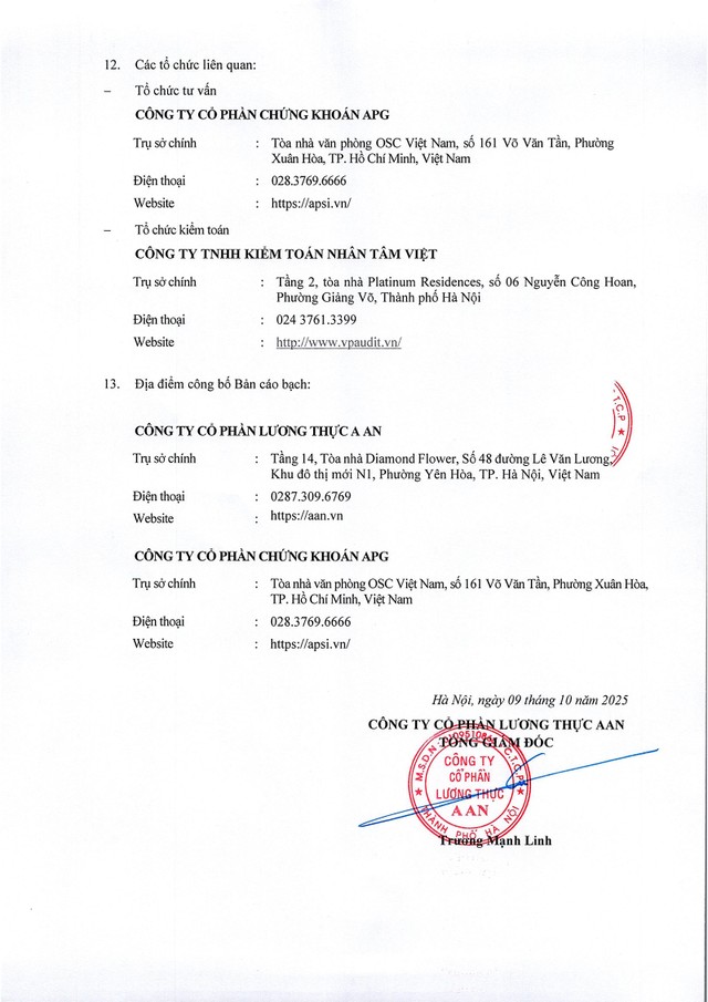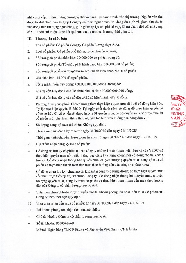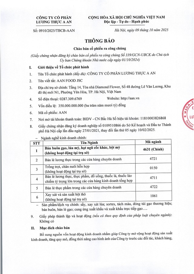 Công ty cổ phần Lương thực A An thông báo chào bán cổ phiếu ra công chúng