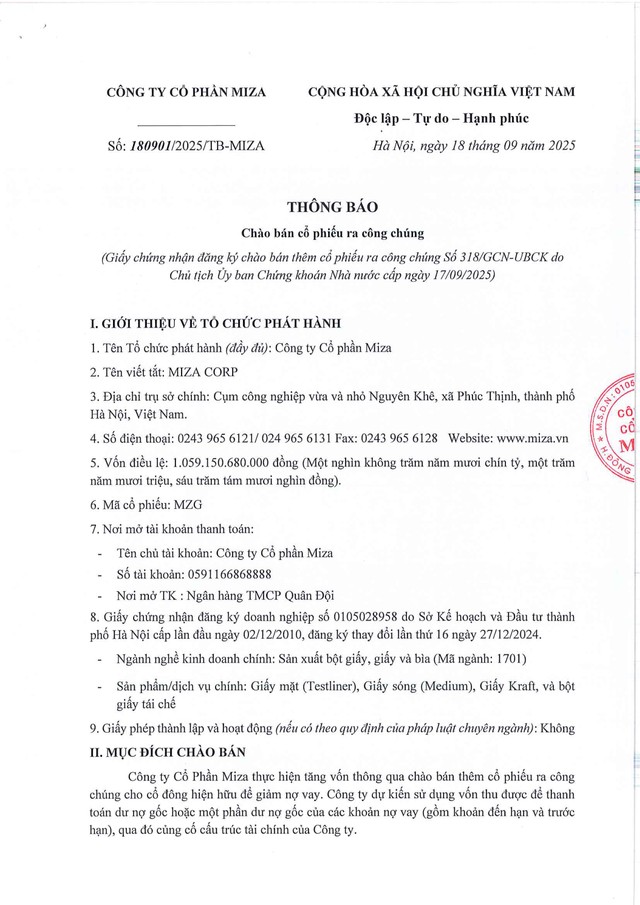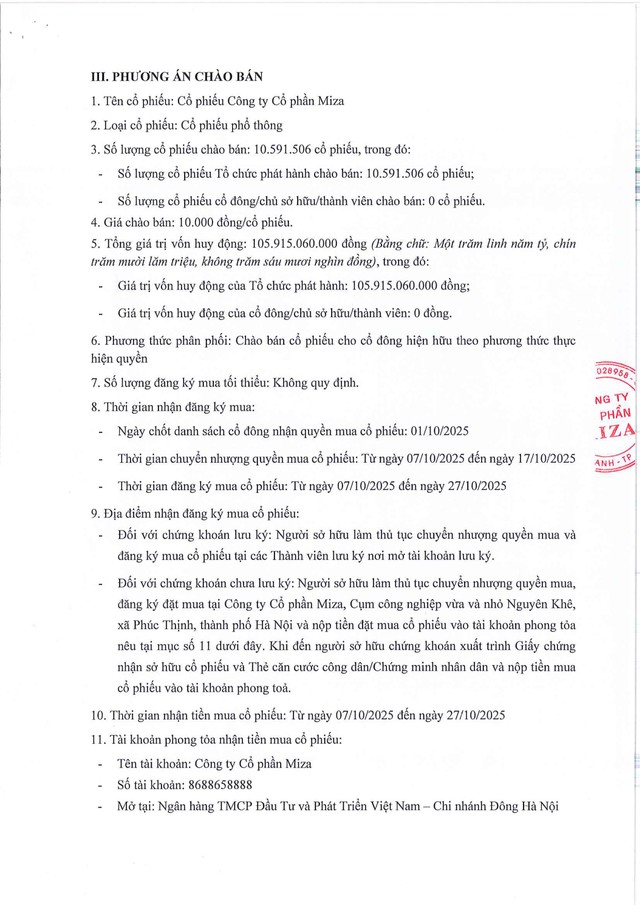 Công ty Cổ phần Miza (mã cổ phiếu MZG) thông báo triển khai chào bán cổ phiếu ra công chúng (Kỳ 3)