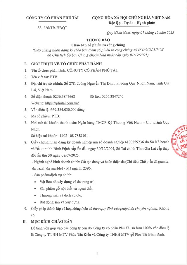 Công ty cổ phần Phú Tài (PTB) thông báo chào bán cổ phiếu ra công chúng (Kỳ 1)