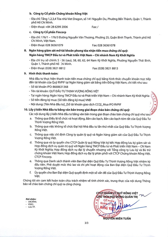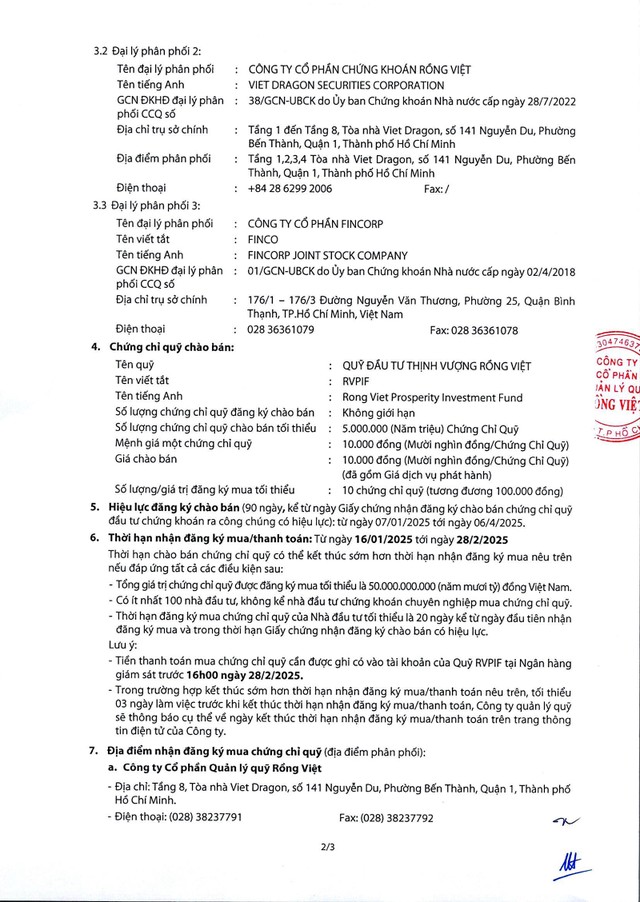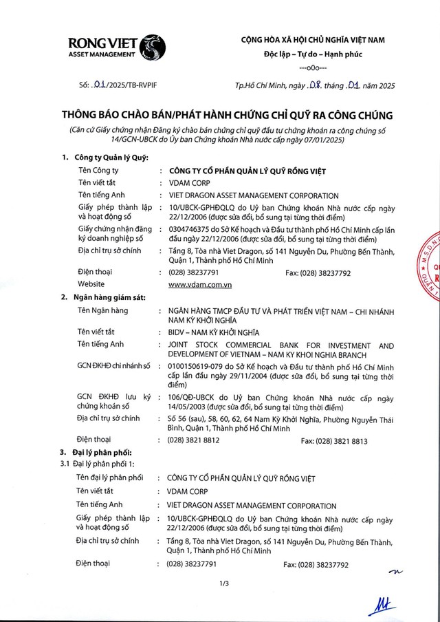 Công ty cổ phần Quản lý quỹ Rồng Việt (VDAM) thông báo chào bán/phát hành chứng chỉ Quỹ Đầu tư Thịnh Vượng Rồng Việt ra công chúng