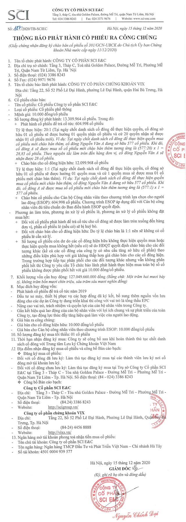 Công ty cổ phần SCI E&C thông báo phát hành cổ phiếu ra công chúng