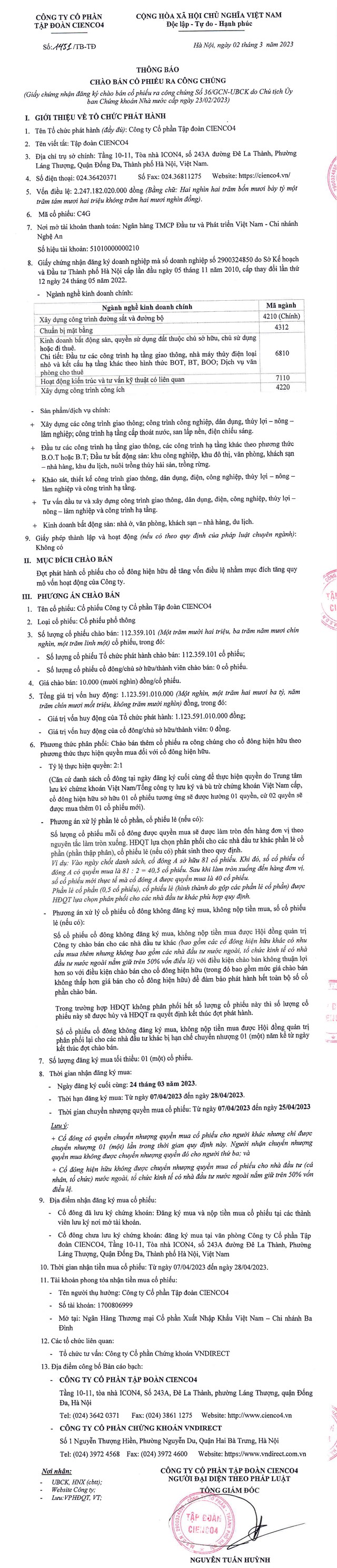 Công ty cổ phần Tập đoàn CIENCO 4 (C4G) thông báo chào bán cổ phiếu ra công chúng