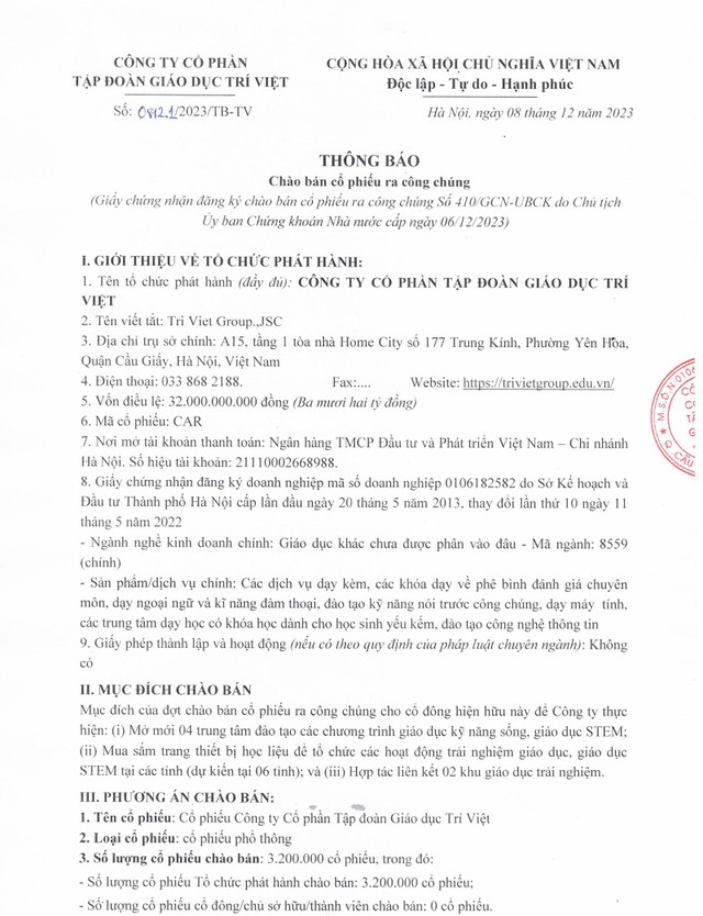 Tập đoàn Giáo dục Trí Việt (CAR) sẽ niêm yết cổ phiếu sau khi thực hiện phát hành thêm cổ phiếu tỷ lệ 1:1