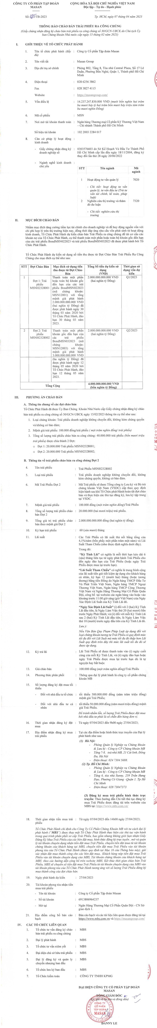 Công ty cổ phần Tập đoàn Masan (MSN) thông báo chào bán trái phiếu ra công chúng