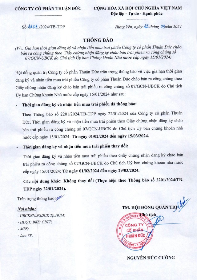 Công ty cổ phần Thuận Đức (TDP) thông báo chào bán trái phiếu ra công chúng