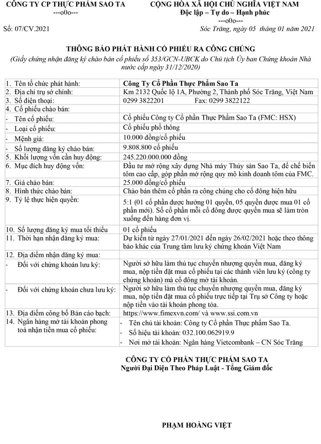 Công ty cổ phần Thực phẩm Sao Ta thông báo phát hành cổ phiếu ra công chúng