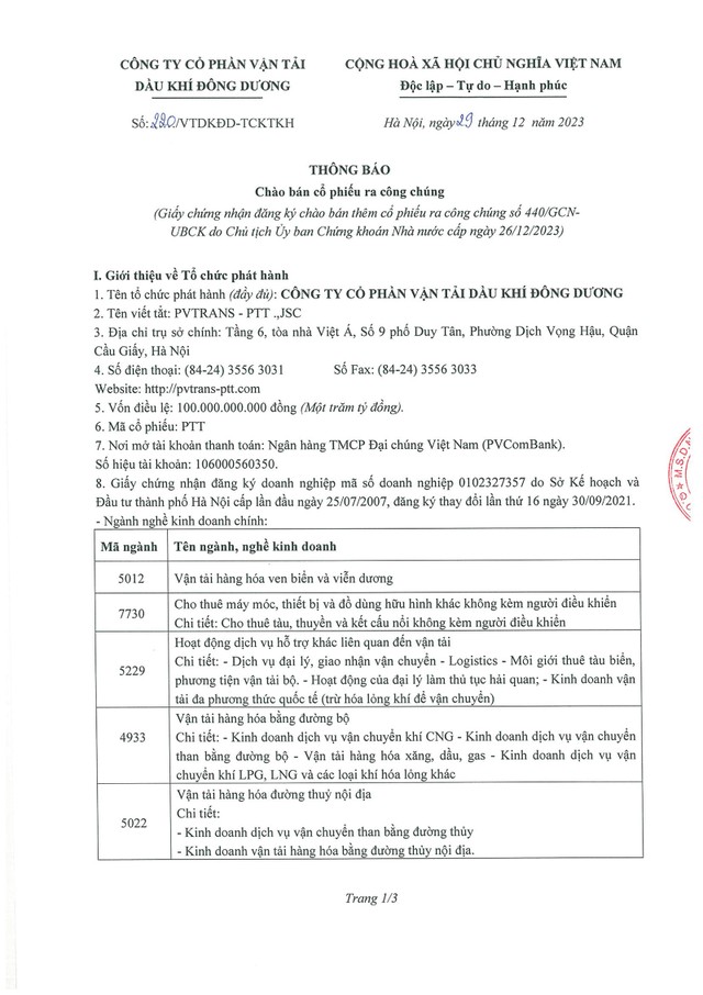 Công ty cổ phần Vận tải Dầu khí Đông Dương (PTT) thông báo chào bán cổ phiếu ra công chúng