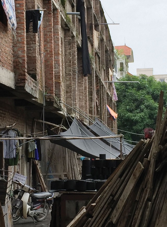 Dãy nhà gần 40 căn liền kề, mỗi căn rộng khoảng 60 m2, thuộc Dự án Khu đô thị mới Yên Hòa. Điều khó hiểu là dự án chưa được hoàn thiện, chưa đủ điều kiện để ở, thiếu điện, nước, các tiêu chí về an ninh, an toàn và có nguy cơ cháy nổ bất cứ lúc nào, nhưng có hàng chục người lao động tự do sinh sống từ 3-5 năm nay.