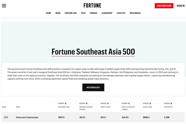 2025 là lần thứ hai liên tiếp, Coteccons được BXH Fortune SEA 500 vinh danh. Năm 2024, Coteccons đứng hạng 376 và năm nay đã thăng 72 hạng, giữ vị trí 304.