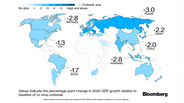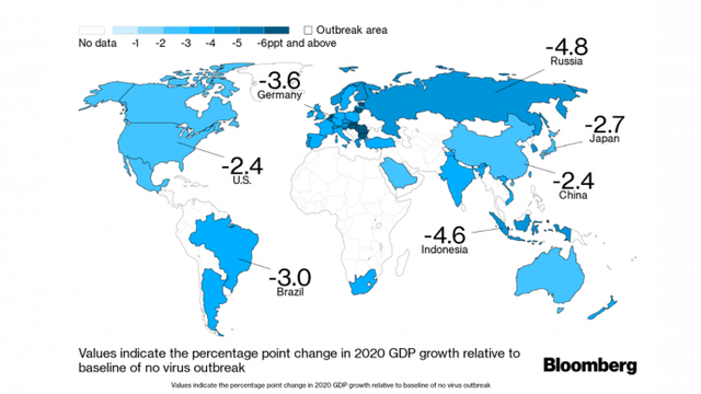 Bloomberg Economics ước tính rằng, tăng trưởng GDP trong quý I/2020 của Trung Quốc sẽ đạt 1,2% so với cùng kỳ năm ngoái, mức thấp nhất từng được ghi nhận. Nếu Trung Quốc không nhanh chóng quay trở lại hoạt động trong tháng 3, con số trên thậm chí còn khá lạc quan.