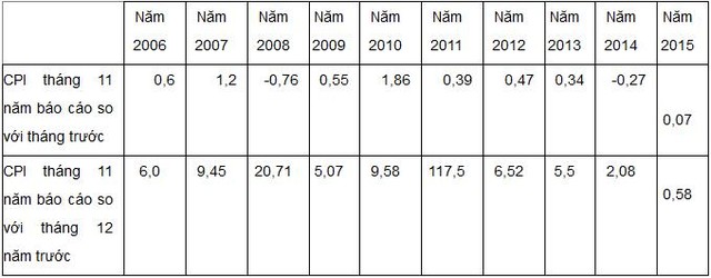 Số liệu của Tổng cục Thống kê cũng cho thấy, CPI bình quân 11 tháng đầu năm 2015 so với cùng kỳ năm trước tăng 0,64%.