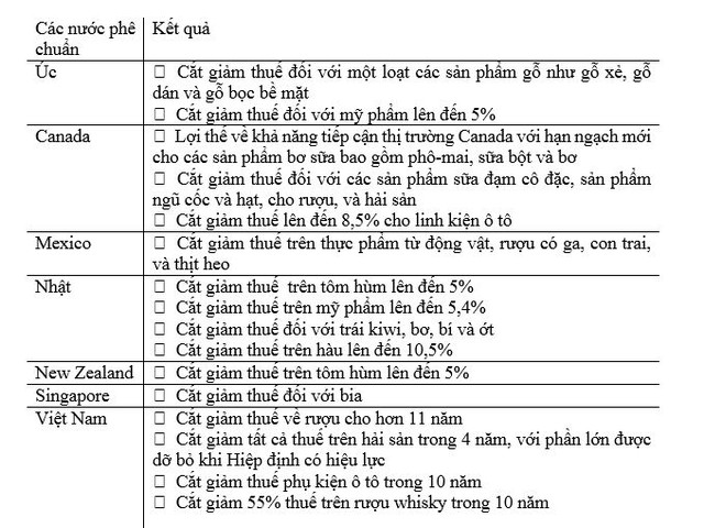 Mặc dù sự thay đổi là không đáng kể đối với các thị trường Việt Nam đã ký thỏa thuận thương mại song phương hay đa phương, nhưng đối với Canada, tác động sẽ rất tích cực. Canada là thị trường lớn thứ hai trong số các nước thành viên CPTPP mà Việt Nam chưa có thỏa thuận thương mại song phương. Quốc gia này cam kết cắt giảm 94,9% các dòng thuế nhập khẩu, hay 77,9% doanh thu nhập khẩu từ Việt Nam.