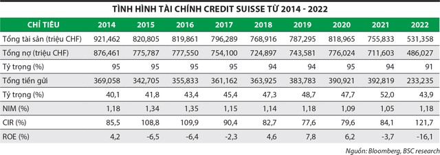 Thứ nhất, khẩu vị đầu tư rủi ro cao. Mảng hoạt động ngân hàng đầu tư liên tục thua lỗ khiến hiệu quả hoạt động thấp. Bên cạnh đó, một số vụ lùm xùm pháp lý, scandal trong 2 năm qua khiến uy tín của Credit Suisse giảm sút, lượng tiền gửi của khách hàng trong năm 2022 giảm mạnh, riêng quý IV/2022 mất khoảng 38% lượng tiền gửi.