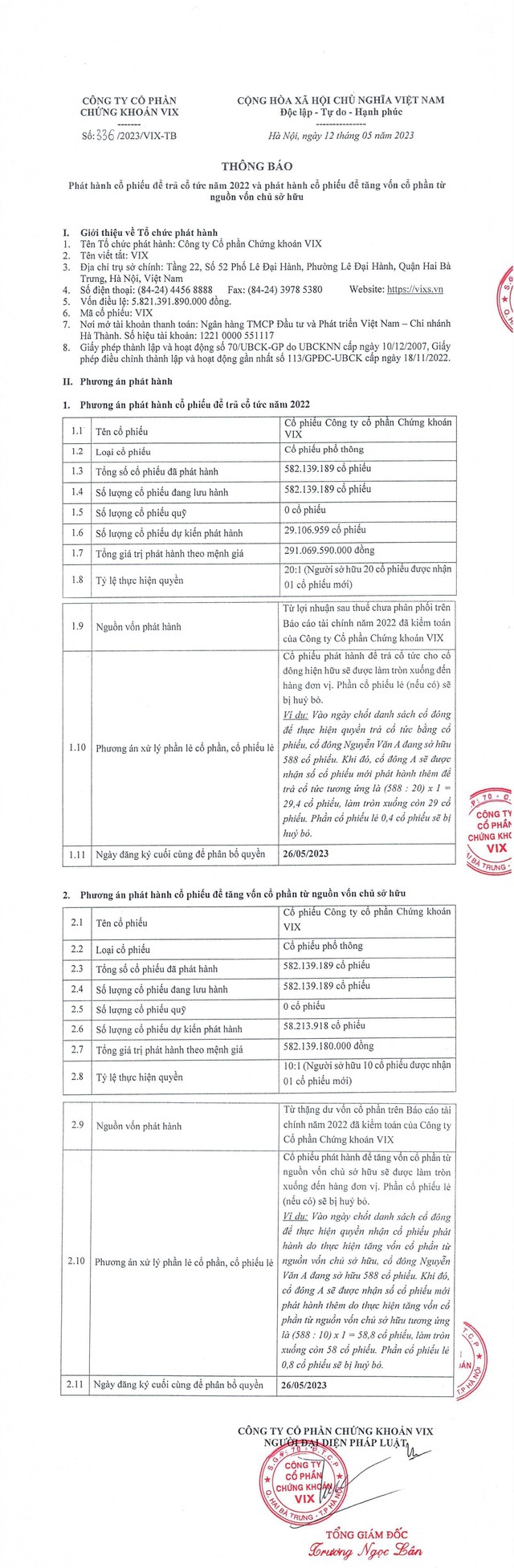 CTCP Chứng khoán VIX thông báo phát hành cổ phiếu để trả cổ tức năm 2022 và tăng vốn cổ phần